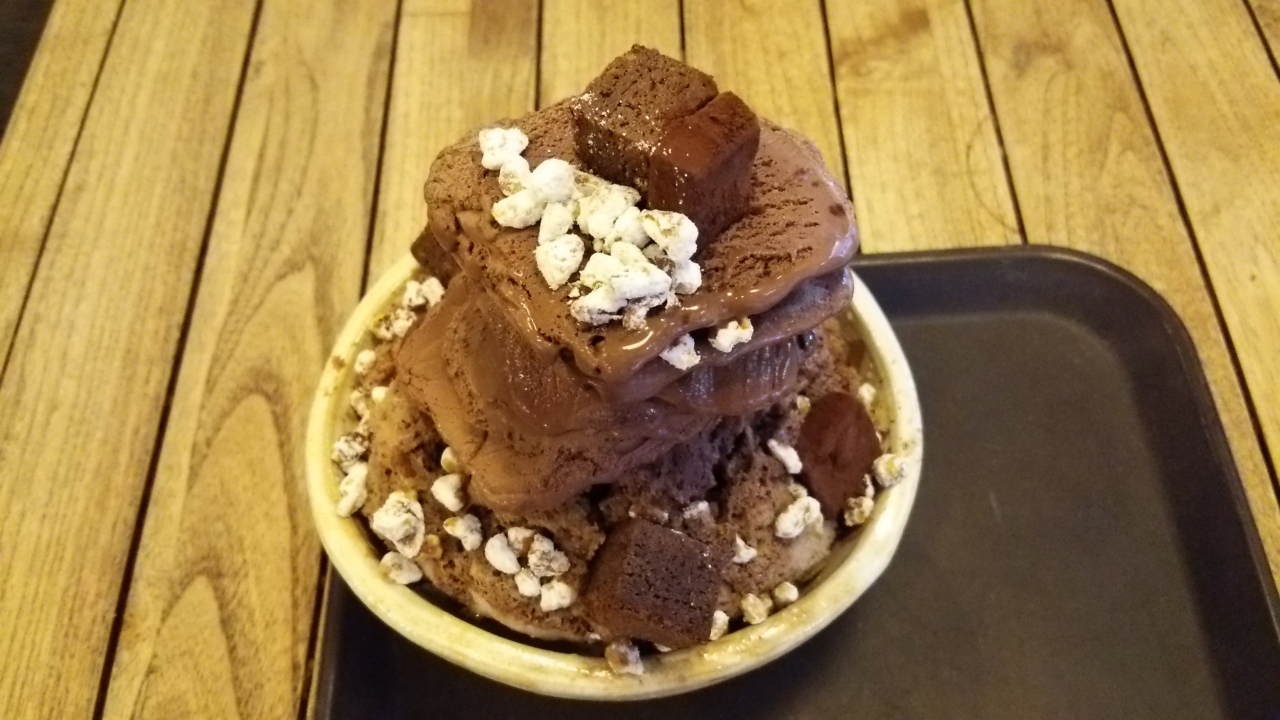 明洞で夕食後に頂きました。かき氷、チョコレートアイス、生チョコ、ブラウニーがのったピンスです。レジで器のサイズを選択するよう言われ(レギュラーとラージ)レギュラー11800Wを注文。チョコレートアイスは美味しかったけど、値段と味を考えるとリピはどうかなという感じでした。
