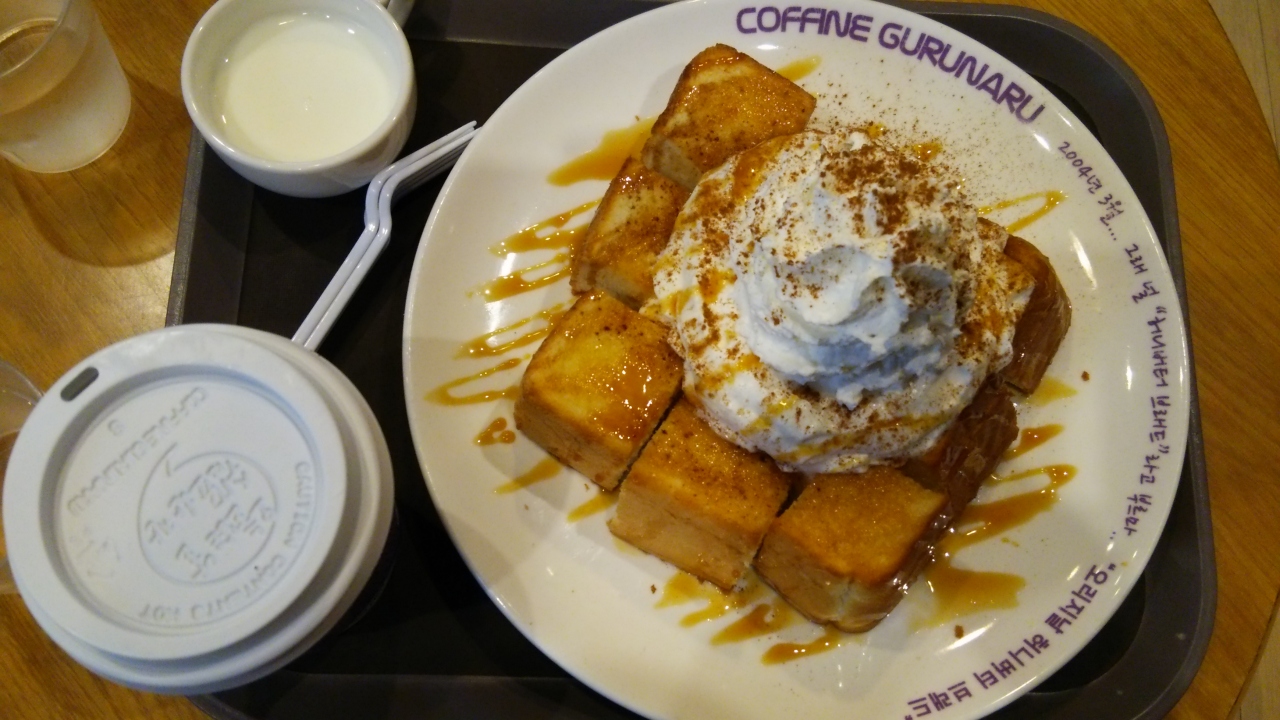 朝食で利用しました。場所はイビスアンバサダー明洞の隣のビルです。2階で食べましたが、3階と4階もあるようでした。ハニートーストブレッドのSセット7800Wを注文。セットにするとコーヒー付です。厚切りトーストは外はカリッと、中ふわふわで美味しく頂きました。
