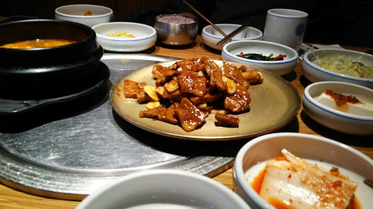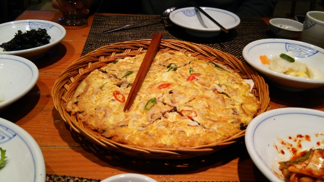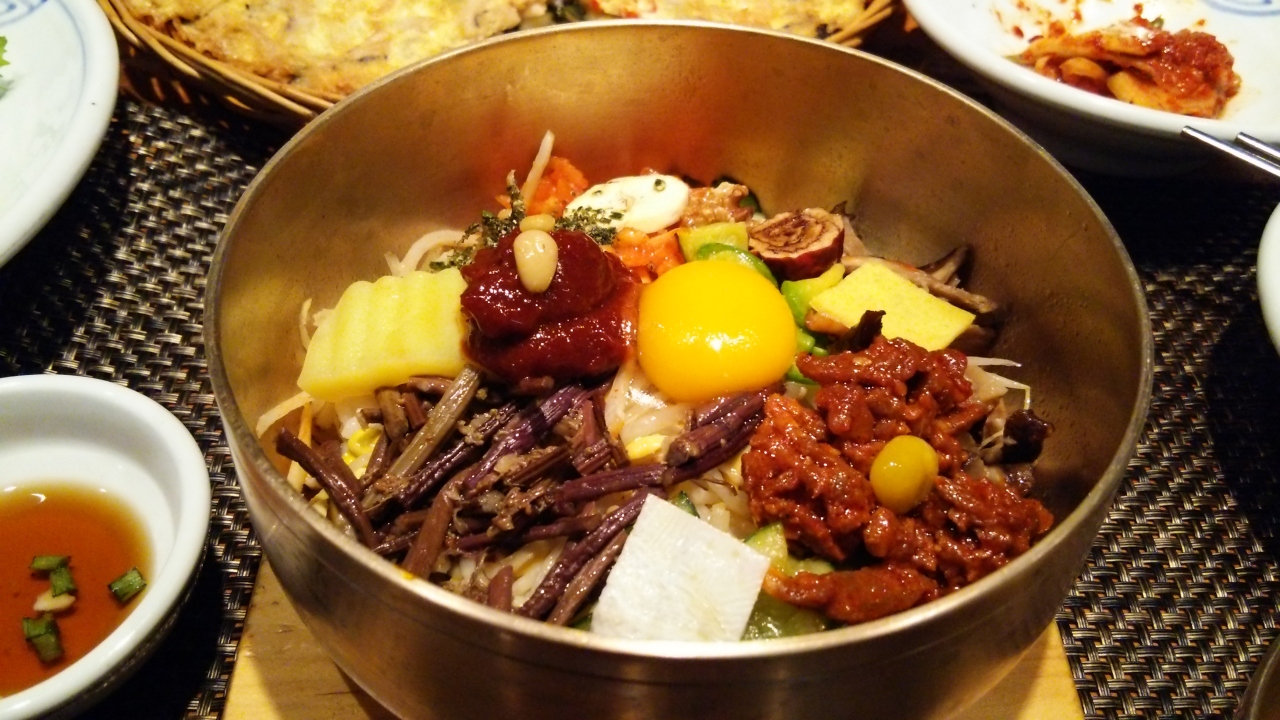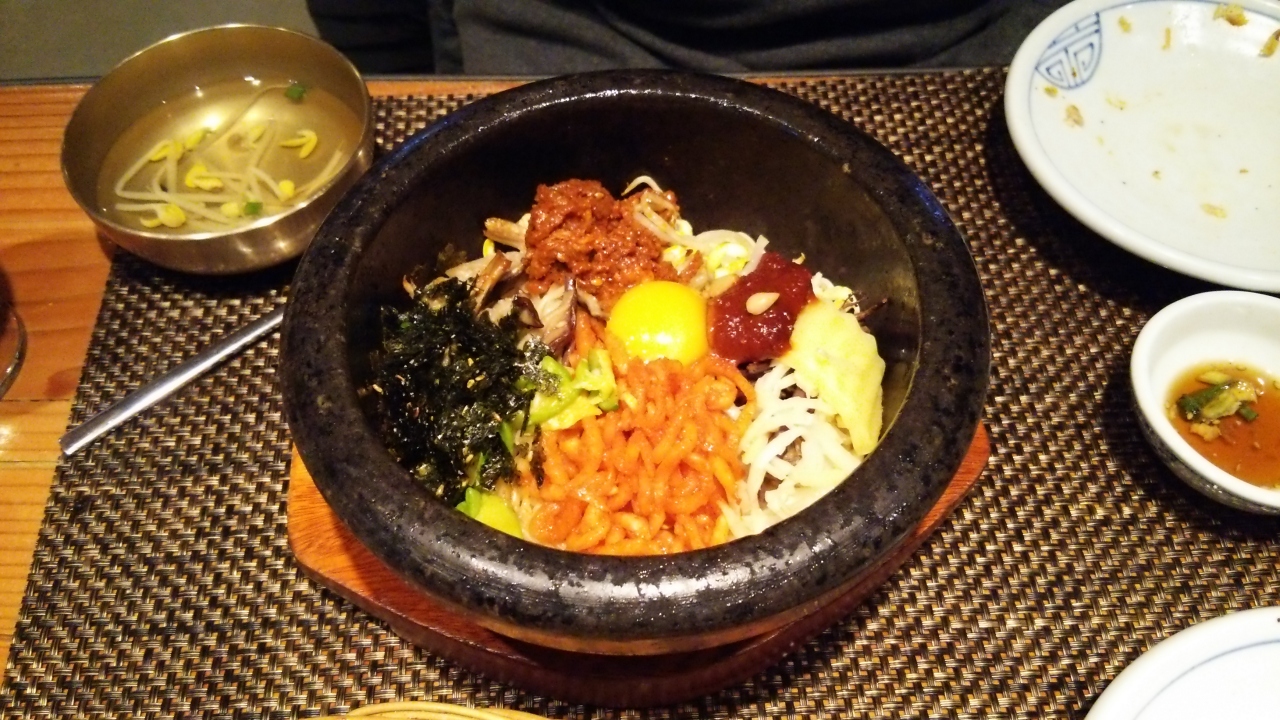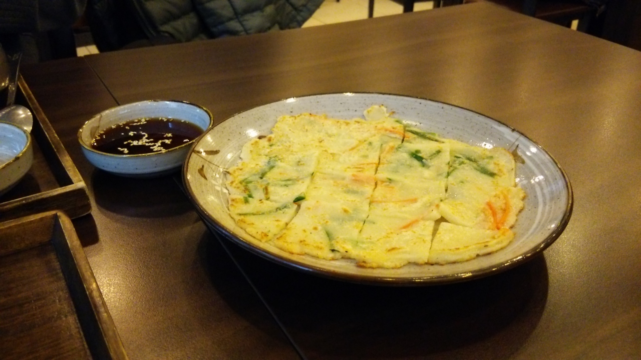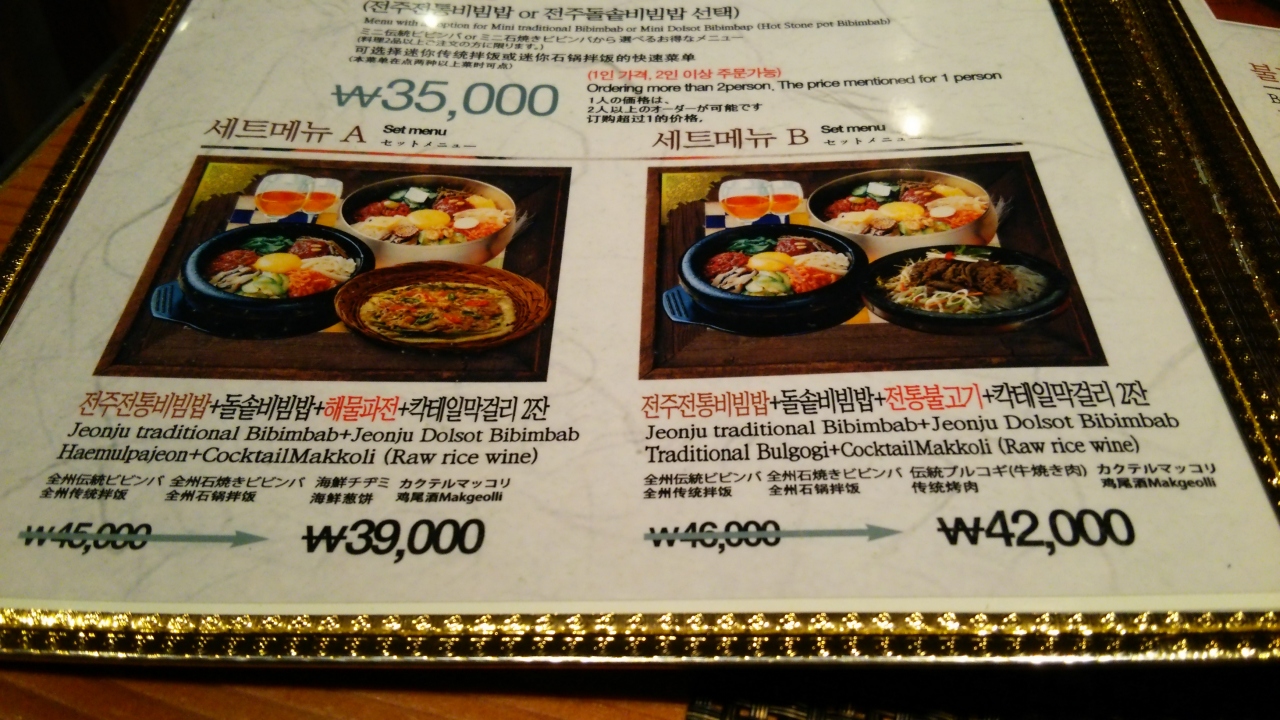 店内は広く、席数はかなりあるように思いました。料理はカートで運ばれてきました。Aセット(伝統ビビンパ、石焼ビビンパ、海鮮チヂミ、カクテルマッコリ)を注文。途中、生演奏もあり雰囲気はなかなか良いと思いますが、値段は観光客価格だと感じました。チヂミがお腹いっぱいで半分位しか食べられず残りはお持ち帰りにしてもらい、ホテルで夜食として頂きました。
