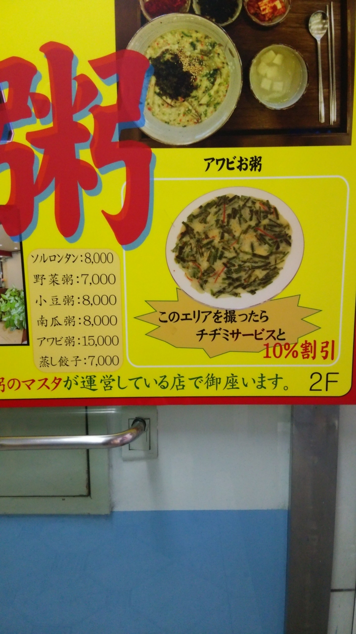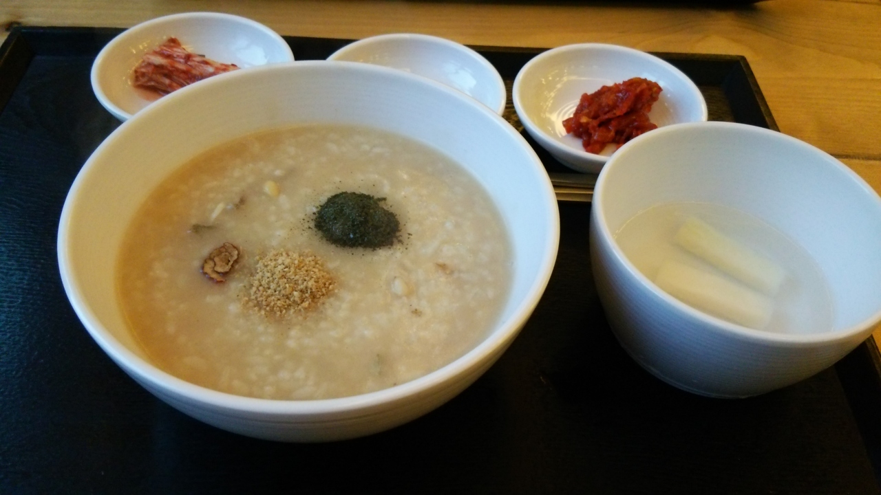 ロイヤルホテルの斜め前、神仙ソルロンタンにも近いビルの2階にあります。店内は白を基調とし清潔な感じでした。入店すると店員さん1人、注文後、調理担当のアジュンマが2人きました。あらかじめ大鍋で生のお米をスープで炊いてお皿に盛るだけかと想像していたのですが、スープに炊いた白飯を入れていたように思いました(なので提供まで少し時間がかかった)あわび粥、プルコギ粥を注文。プルコギの方が美味しかったです。