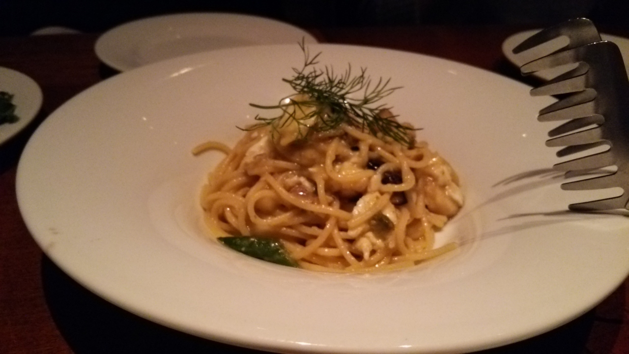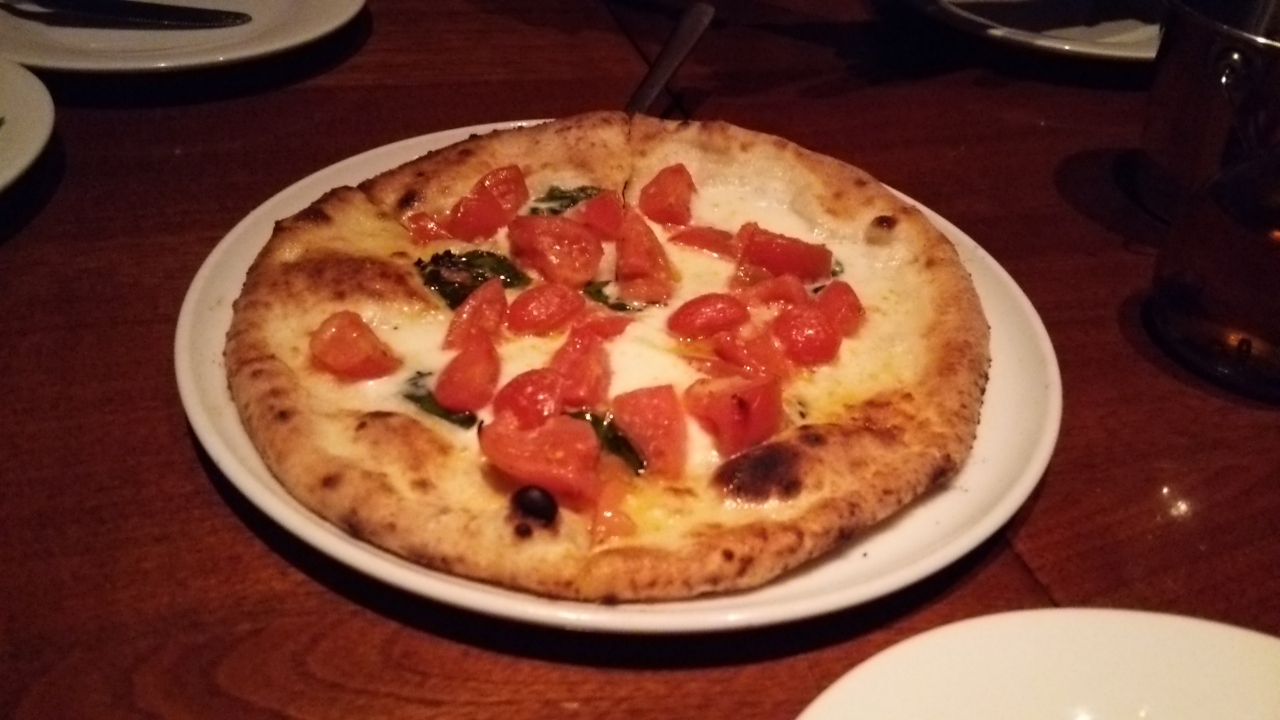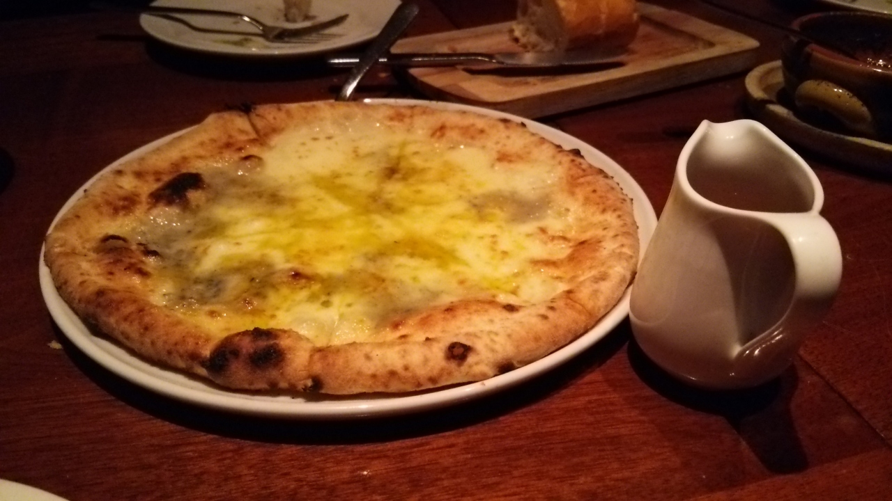横浜駅西口を出て鶴屋町方向へ、川を渡りすぐ右に入ったビルの1階にあるお店です。店内は暗めの照明で同じフロアを歩くだけなのに所々に階段があり少し気をつけないと転びます。前回と同じ「クアトロフロマッジョ」のピザも注文。全体的にお酒が進む濃いめの味つけでした。