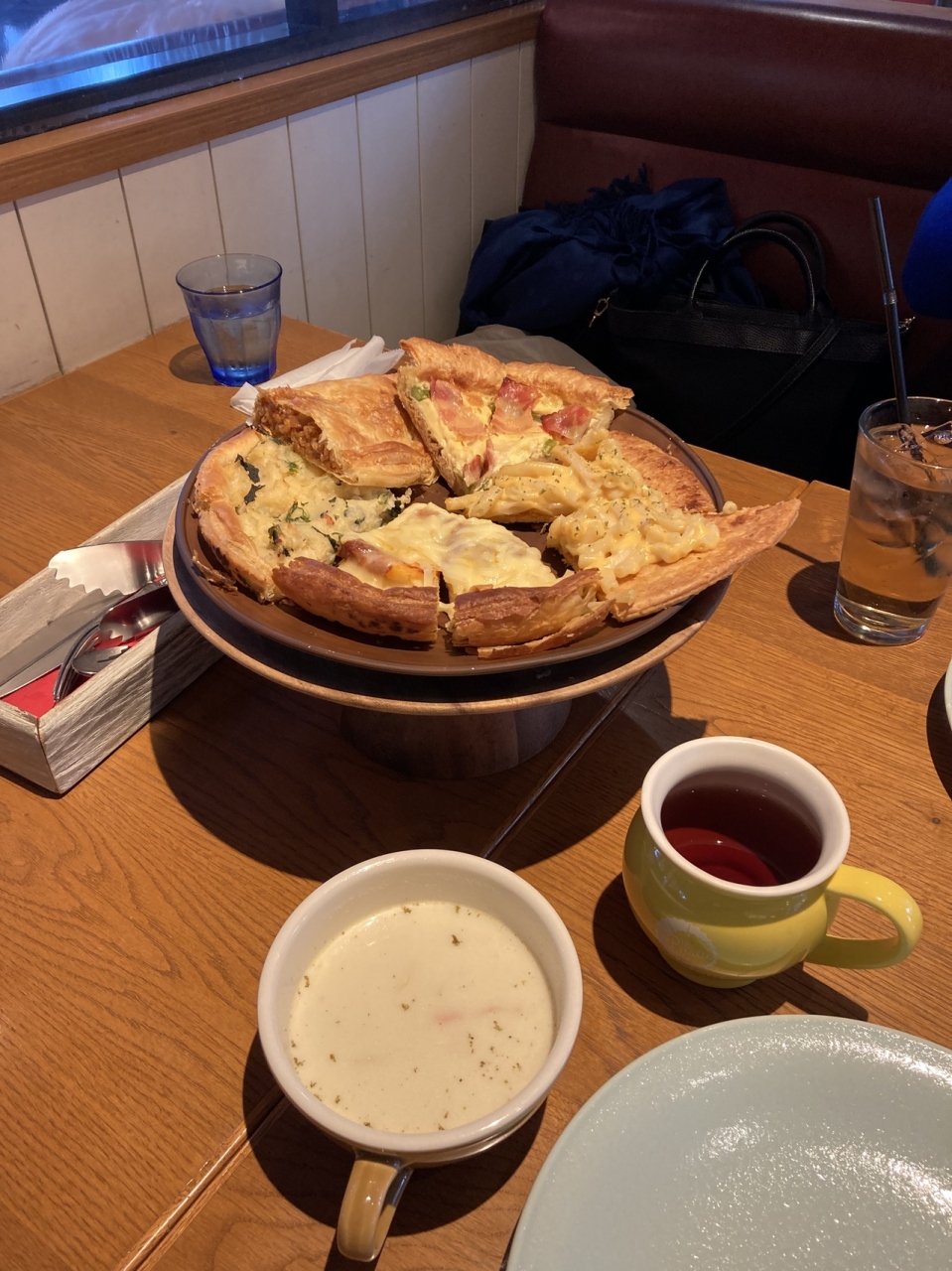 桜木町駅から徒歩でMARINE &WALKへ。友人が予約してくれて12時45分の回に行きました。ランチは11時、12時45分、14時45分の三部制。食べ放題のパイメニューは2ヶ月事に変わるみたいです。サラダかスープ、メインを選んで最初に当日のパイメニュー5種が人数分運ばれてきました。パイのおかわりは好きなパイ、個数で頼めました。ドリンクは同じものをおかわり可能。紅茶はホットからアイスも変更できました。パイのおかわりは2つ、マッケンチーズパイとミートソースグラタンパイにしました。デザート付で予約したためダッチアップルパイも食べて、食べ過ぎました。次の回の準備があるから仕方ないと思いますが、割と早く片づけられちゃうのでゆっくりできない雰囲気。ラインの友達登録で100円引になりました。
