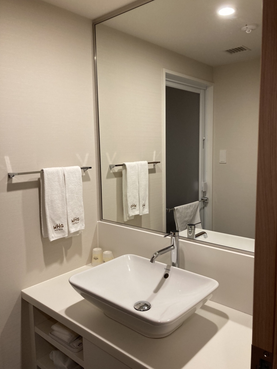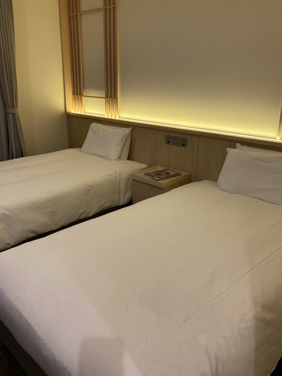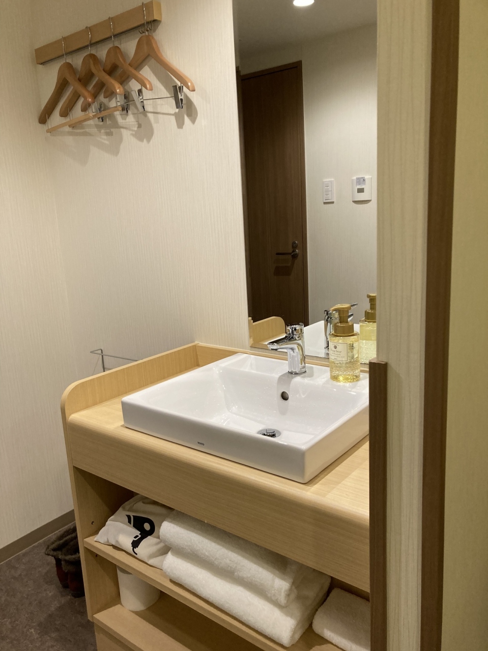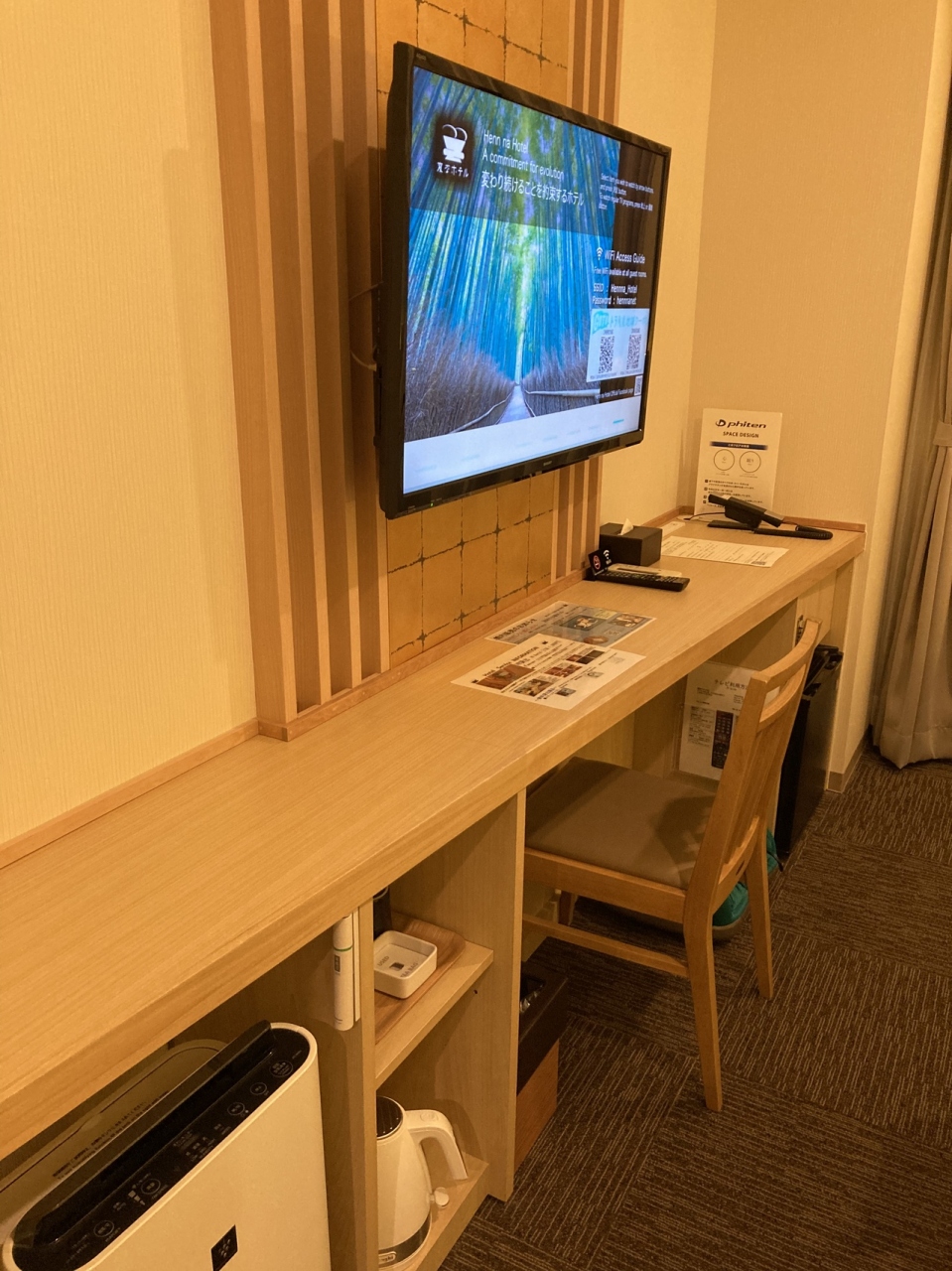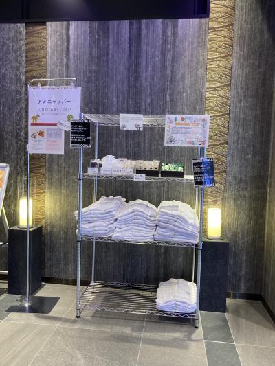 JR京都駅から近くてバストイレ別のホテルという事で1泊しました。八条東口から信号を渡るけどかなり近く立地良し。京都タワーとは反対側。ファイテンルームは足マッサージ機つき。洗面台と浴室が通路挟んでいて着替えを置く場所はないのがマイナス。フロントには恐竜ロボット、アメニティもセルフ。無料の水ペットボトルは無しでした。