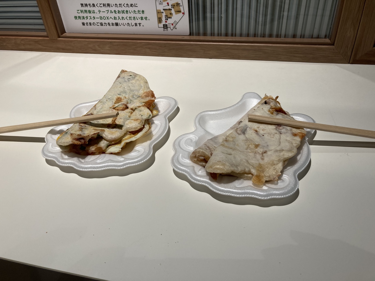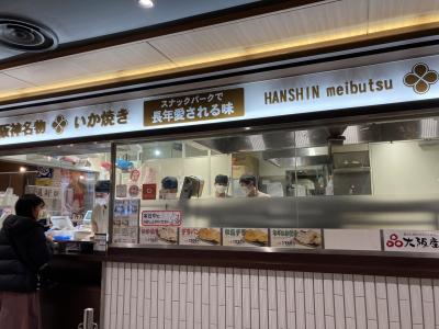 平日の20時近い時間に行ったので行列は無くガラガラでした。阪神梅田本店の地下食品館でうろうろ探しサービスカウンターで聞くとスナックパークは同じ地下でも別の建物になると言われ移動し到着。イカ焼き、ネギイカ焼き、デラバンを購入し窓側に面したカウンターで立食いしました。想像していた食感と味では無かったので面食らいました。