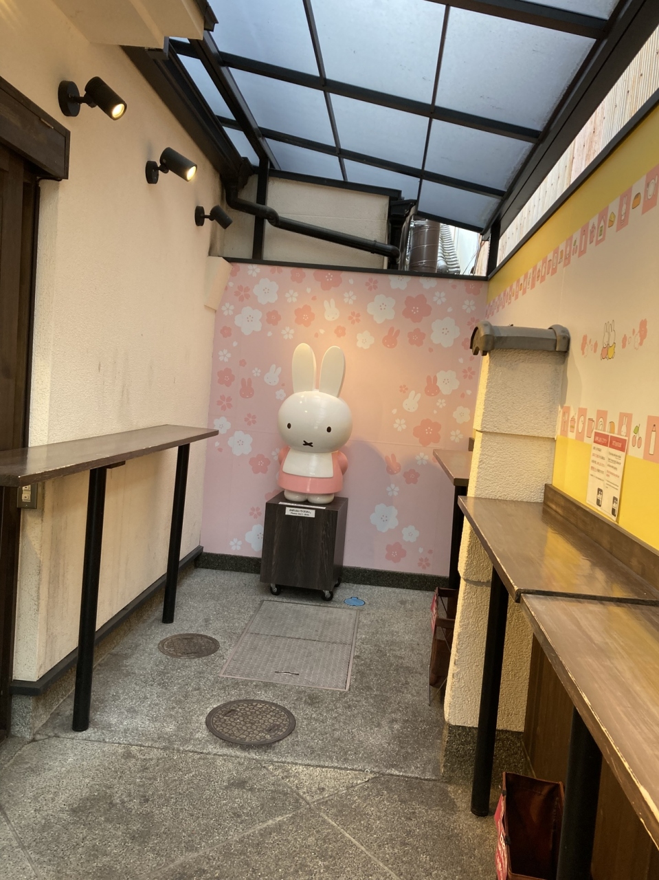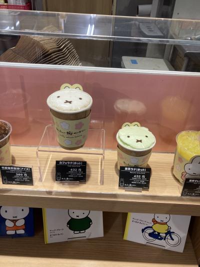 ミッフィー好きの友人のお土産目当てで訪問。入口に着物姿のミッフィーがいたり店内もミッフィーづくしでかわいいお店です。何を買ったらいいかわからなかったので限定商品のふわもこカップスリーブに、ドリンクを注文しないと購入できないのでカフェラテをテイクアウト。カフェラテもミッフィーの顔になってました。