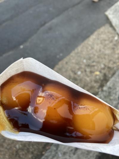 竹林散策し渡月橋に向かう途中、角の和菓子屋さんで炙りみたらし購入。お店の周りはかなり人通りがあるので立食いもゆっくりはしてられません。小腹がすいていたのもあってみたらしにしたけど1本280円は安くはないですね。団子は普通、たれはたっぷりでした。