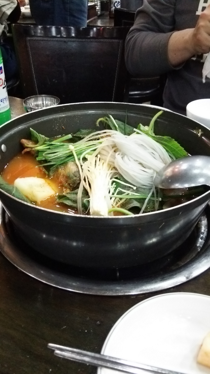 ホテルに着いたのが遅かったので24時間営業のこちらの店に入店しました。二人でカムジャタンの中、チヂミ、マッコリを注文。ソウルでカムジャタンは2軒目でしたが、こちらのは口に合いませんでした。場所は明洞だし24時間営業だし良いと思います。