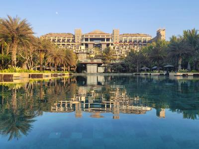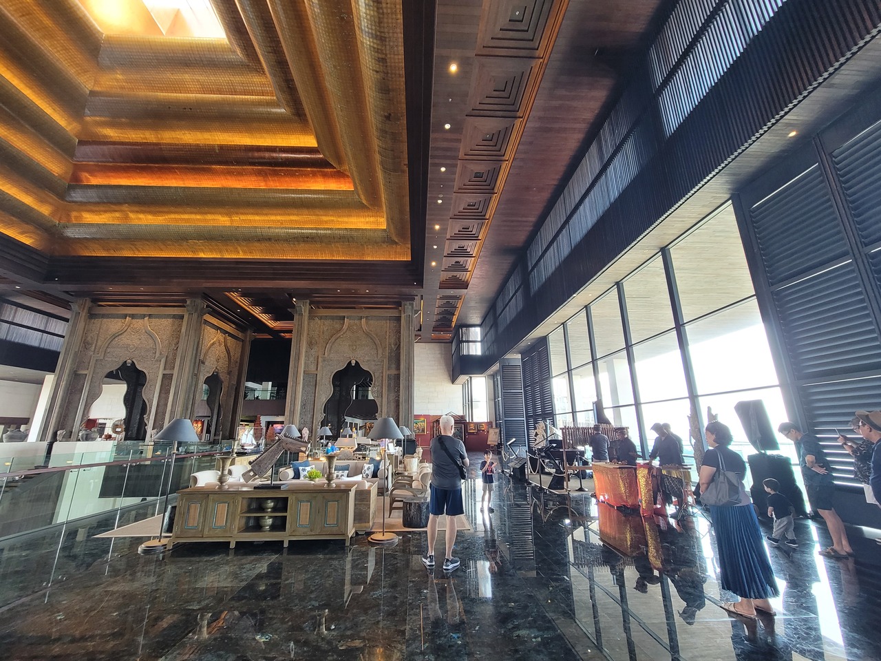 海側から見たホテルの様(さま)が特徴的で、それは旅行前から伝わるものだったが、実際の建築のすごさ、デカさに、現地ではロビーから圧倒された。