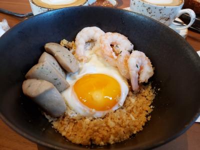 朝は、1階のカフェで、無料のコーヒー、紅茶、カフェオレなど。おすすめは、カリフラワーのライスボウル。コーヒーは550円と、それほど高くないので、宿泊しなくても犬を連れてふらっとお茶するのも有りかと思います。