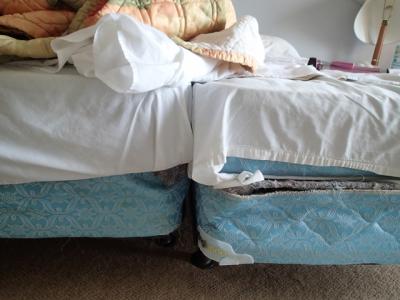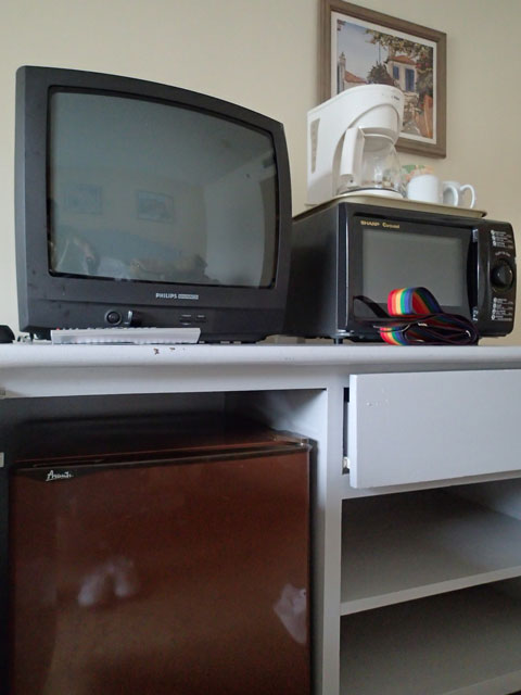 グアムって、基本的に古いホテルばかり。その中にあって、特にここは、改装とは無縁なのだろう。じゅうたんのシミや、写真の通り、ありえないこのベッドのマットレスのボロさ。日本では、この状態では売り物にはならないだろう。オープンしてから、一度も替えていないのでは? テレビはもちろんブラウン管。
