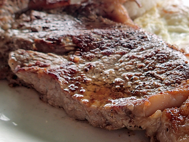 【料理】朝からステーキ食べました。それほど厚みはありませんが、朝食として食べるにはちょうどいいです。塩コショウも効いていて、想像以上に味も良く、『バナナTVグアム編』で設楽さんが「うっめ~~~~~~!!」言っていたのは、誇張ではないなと思いました。BBQソースなどをかけずに、美味しくいただきました。エッグベネディクトは、大味で、オランデーソースの味も濃いめのような気がします。