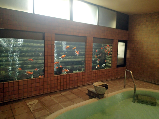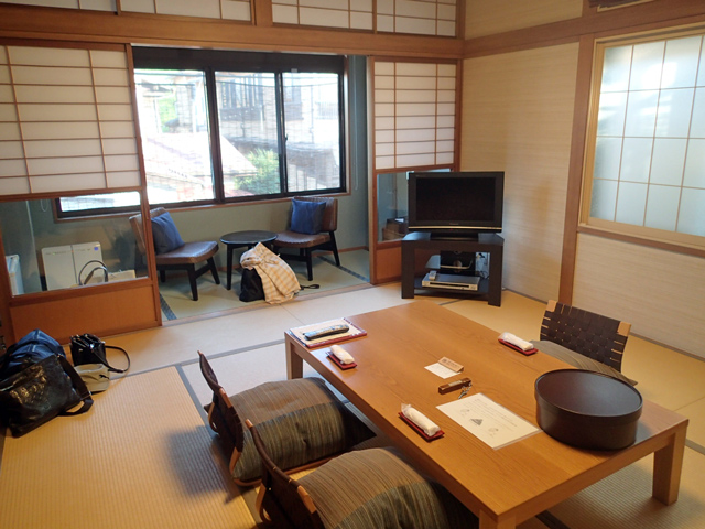 吉永早百合さんが2泊した(2014年4月)九兵衛旅館の手前にある別館。温泉は、最上階にある展望浴室と、1階に2室。全て貸切ですが、予約は必要なく、空いているときにいつでも入れるシステム。予約不要じゃなかなか入れないんじゃ? という心配はまずない。客室がそもそも8室しかない。大浴場に入りたいときは、お隣(徒歩1分)の九兵衛旅館の温泉浴室もいつでも利用可能だ。