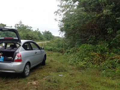 石碑の場所に車を置いて、獣道を進みます。途中途中に目印もありますが、迷いそうになる場所はあり。雨だとかなり悪条件。足元がすべる。