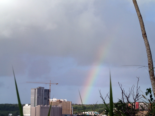 気にせず、海が見える際のほうへ歩くと、正面にフィエスタ、ちょっと右に私たちが宿泊したホリデイが見えました。さらに右のほうを見ると恋人岬も。タモン湾が見渡せて、なかなかの景色、と言いたいところですが、眼下に見える廃墟ビル(?)の屋上の存在が大きい。