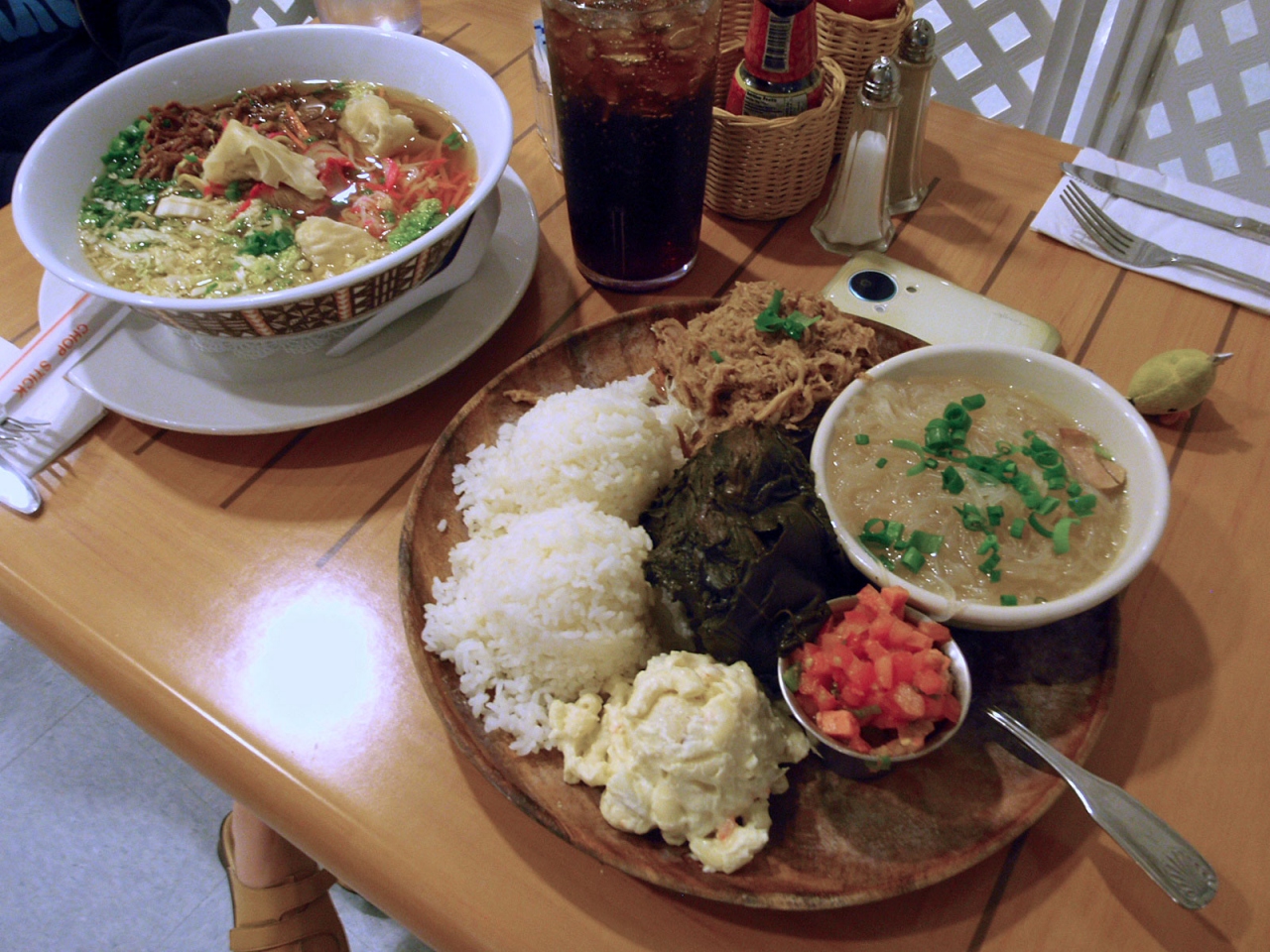 カルアピッグ、ポークラウラウ、ロミロミサーモンサラダなど、地元の郷土料理的なものが一度に食べられる「ハワイアン・プレート」15.99ドルがオススメ(私はこれをオーダーしました)。
