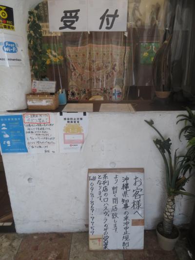 翌朝利用する泊ふ頭から徒歩圏内で最安値の宿ということで、某予約サイトで予約するも、現地に行くと受付には誰もおらず、「お客様へ 沖縄県知事の来沖中止規制により、暫く閉店致します。系列店のロハスヴィラのみの営業となります。」の案内が。予約後そんな連絡はなかったので愕然。仕方なく記載されている電話番号に電話するが、タイミングが悪かったのか、誰も電話に出ず。時間を空けて再度電話をかけようと受付で待機していると、たまたま従業員の方が外から入ってこられたので確認すると、ロハスヴィラに泊まって欲しいとのこと。しかし、ロハスヴィラは1kmちょっと離れた場所なのと、私は泊ふ頭に近いからこの宿に予約したこと、予約後連絡がなかったことを含め交渉した結果、私はドミトリーで予約していたのだが、シングルの部屋に泊めてもらうことができた。なお、ここに泊まった結果、私以外にも数名の宿泊者らしき方を見かけたので(私の隣の部屋に入って行く人もいた)、暫く閉店という措置は謎。