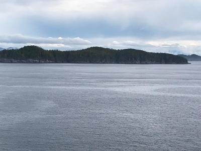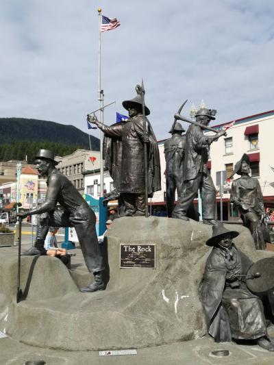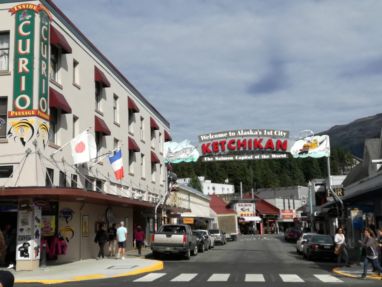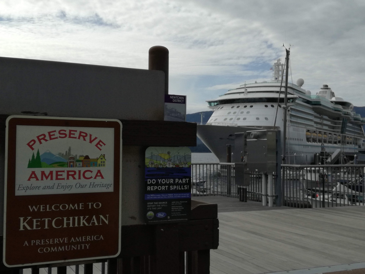 クルーズ船が停泊する港を背に、『Welcome to Ketchikan』の観光表示(?)は多分撮影スポット!