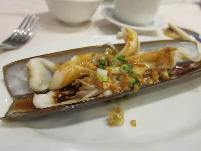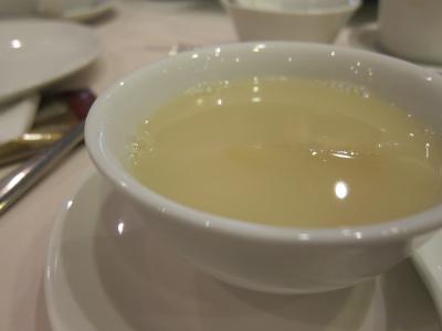 フカヒレのスープをオーダーすると、お皿にプリプリ丸ごとのフカヒレを持ってきてくれて、それを目の前で土鍋に煮立ったチキンスープの中にどぼん!