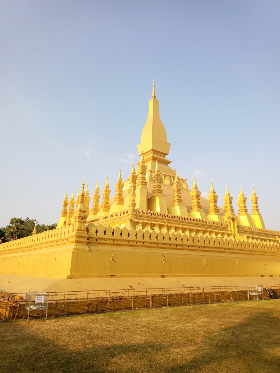 町の中心部からはやや離れています。私は配車アプリのLOCAで行きました。車で近づくにつれて巨大な黄金の寺院が見えてきます。ワクワクします。今まで見たこともないような金ぴかに光るお寺です。行ってみる価値はあると思います。どこから見ても金色です。敷地はかなり広くて黄金の建物以外にも色々な建物があるようです。周りには露店やお店がいっぱいあります。どちらかというとそちらの方にたくさんの人がいるようです。駐車場も広大です。タートルアンの黄金寺院はその中心にあり象徴的な存在なのかもしれません。夕方に行きましたがたくさんの人でにぎわう市場のような雰囲気でした。ただ寺院のそばにはそのようなお店はなく意外と静かに寺院を鑑賞できました。