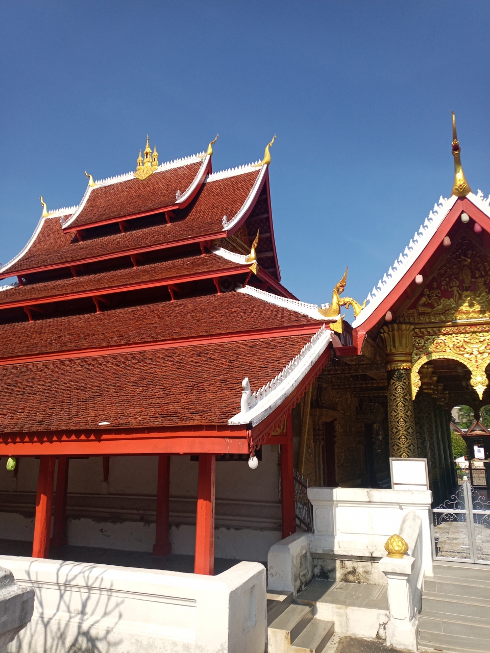 ルアンパバーンの半島側にある寺院です。敷地も広くゆったりと見ることができます。入り口は狭くて両側が露店になってるのでちょっと分かりづらいかもしれません。場所的にどのホテルからも徒歩または自転車で行くことができると思います。