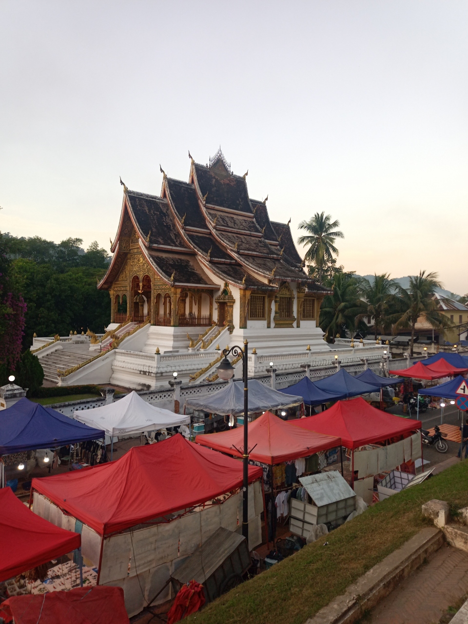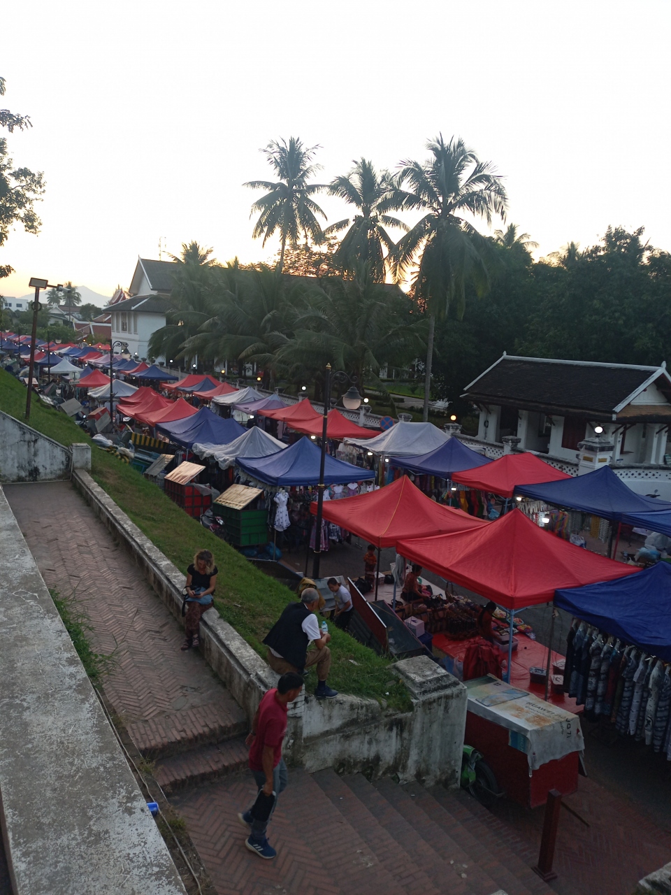 国立博物館の横の道が毎晩夜になるとナイトマーケットになります。その道は国立博物館とプーシーの丘の登山口との間にありますので、夕方プーシーの丘でサンセットを見物した後、国立博物館側に降りてくると色とりどりのテントが見えます。ナイトマーケットは東南アジアでよくある風景ですが、上から見たのは初めてです。しかも上から見ることを意識してそれぞれのテントが綺麗な色です。