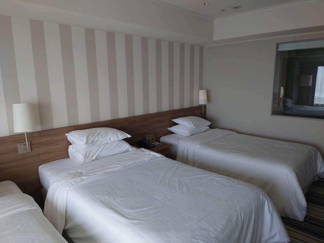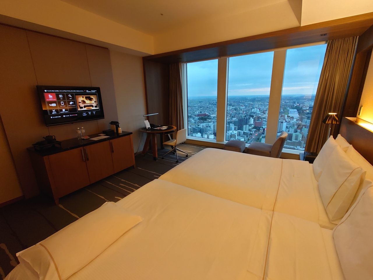 家族3人で1泊利用。デラックスツインにベッド追加。24階。25500円に追加ベッド費6000円でした。