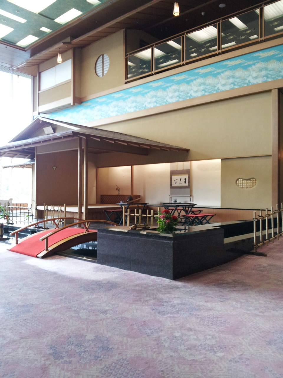 旅館に着くと玄関が広くて、ガラス張りの壁からは湖が見えました。