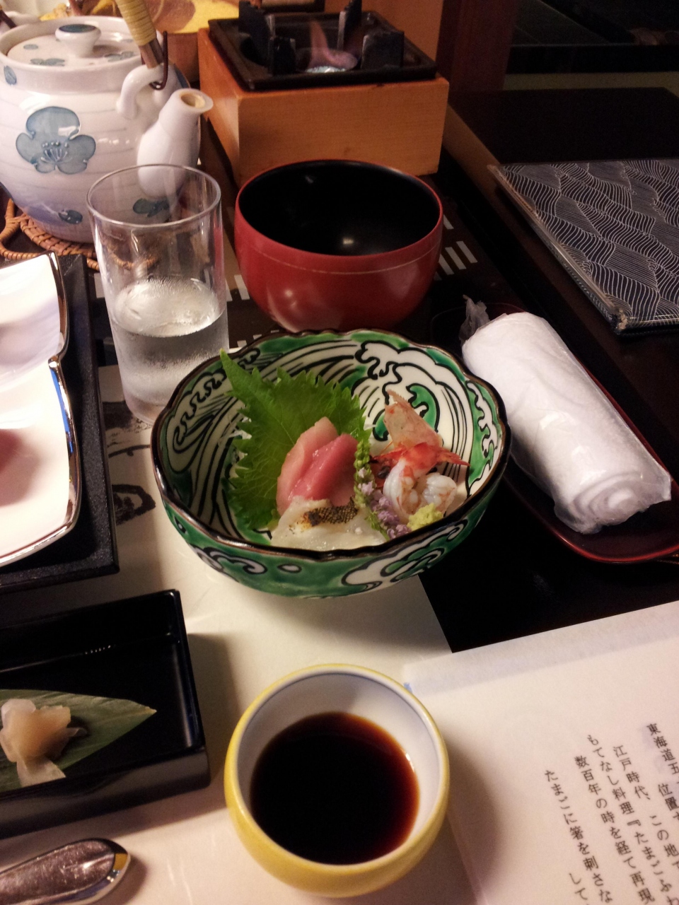 夕食は1階の個室で食べました。個室に入るとすでにテーブルいっぱいに料理が並べてあって、これが全部だろうと思っていたら、伊勢海老、あわび、讃岐牛。。。など、次々出てきて、お腹いっぱいになりました。