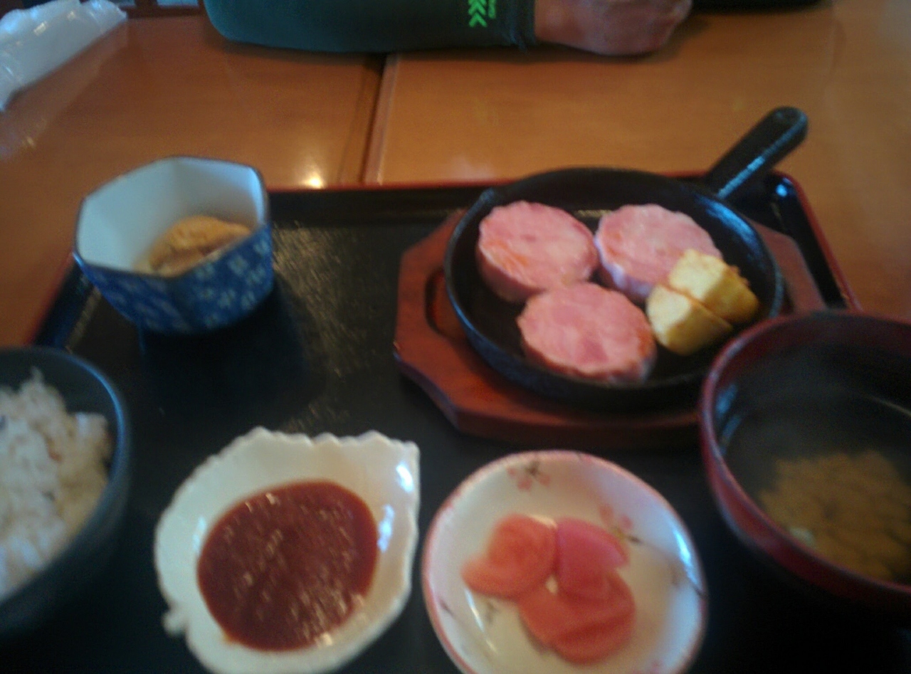 明宝ハムステーキ定食をいただきました。明宝ハムが鉄板の上で焼かれていて、ご飯がすすみます。ご飯はおかわり自由だったと思います。つぎ汁という郷土料理もついていました。すまし汁のようですが、とてもだしがきいていておいしかったです。