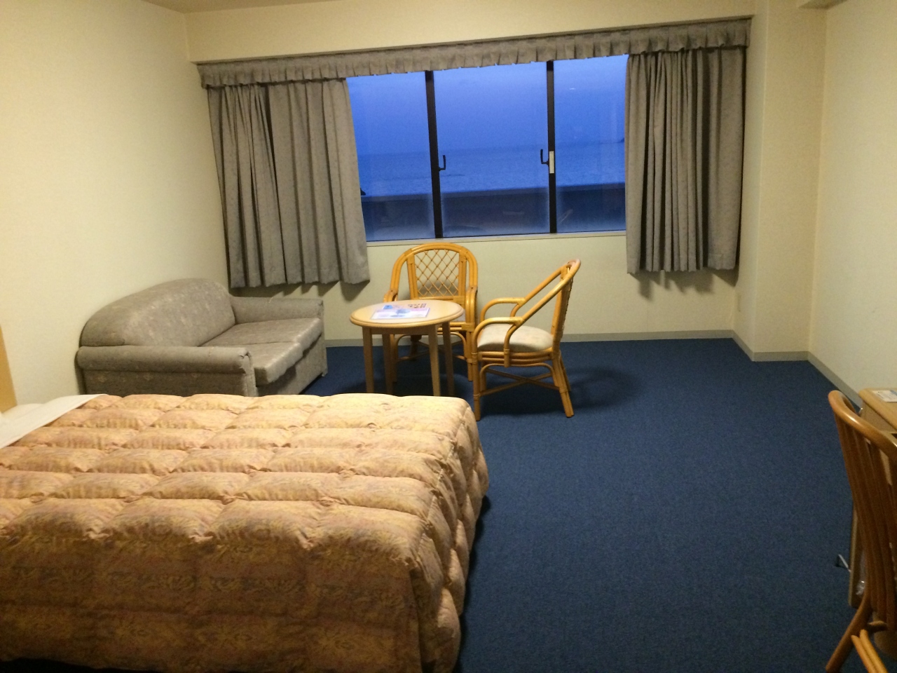 かなり広い部屋にオーシャンビュー、館内設備もゆとりのある作りで、色々大きい。