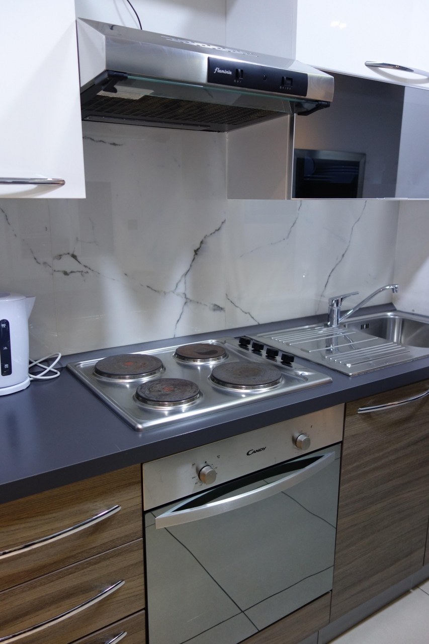 キッチン、冷蔵庫(冷凍庫付き)、電子レンジ、オーブンや食器等備え付けなので、