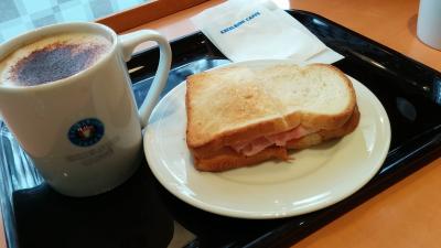 ジャンボハム・レタスサンドにカプチーノ(S)で460円。さらにプラス50円でドリンクをMにサイズアップしました。