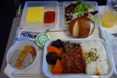 ・エコノミーの機内食は選択の余地はないです。ドリンクも食事の時間のみソフトドリンクが無料でアルコールは有料です。