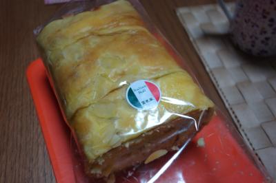 アーモンドをちりばめたシュー生地でスポンジがロールされていて、生クリームの中には栗がはいっています。
