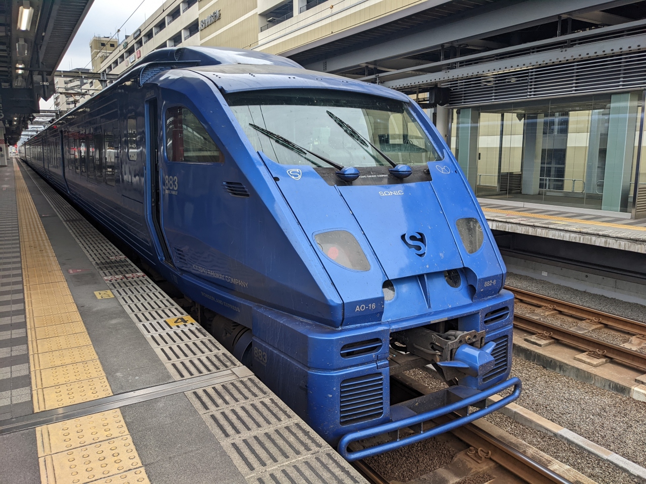 大分-杵築間だけ利用しました。メタリックブルーの車体の883系でした。沿線の海の色をイメージした色だそうです。