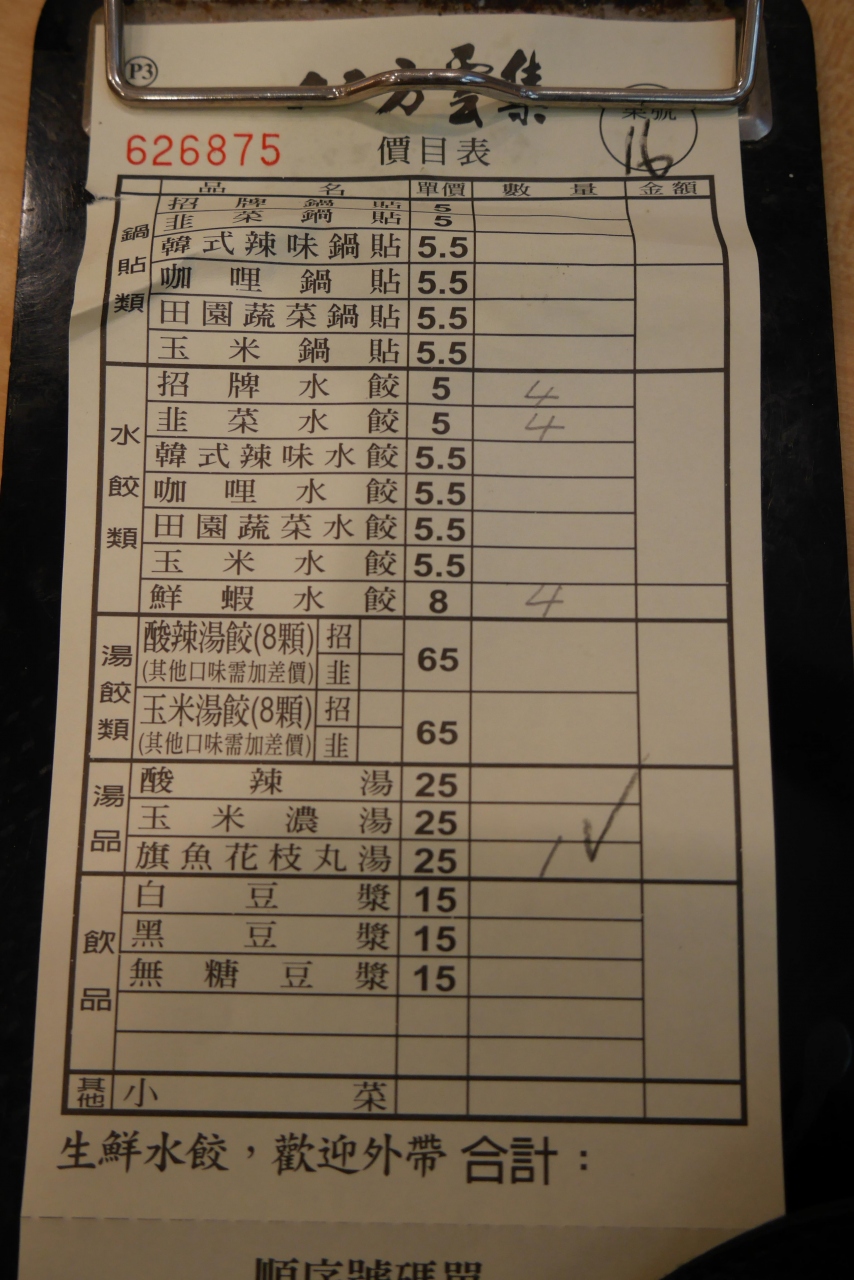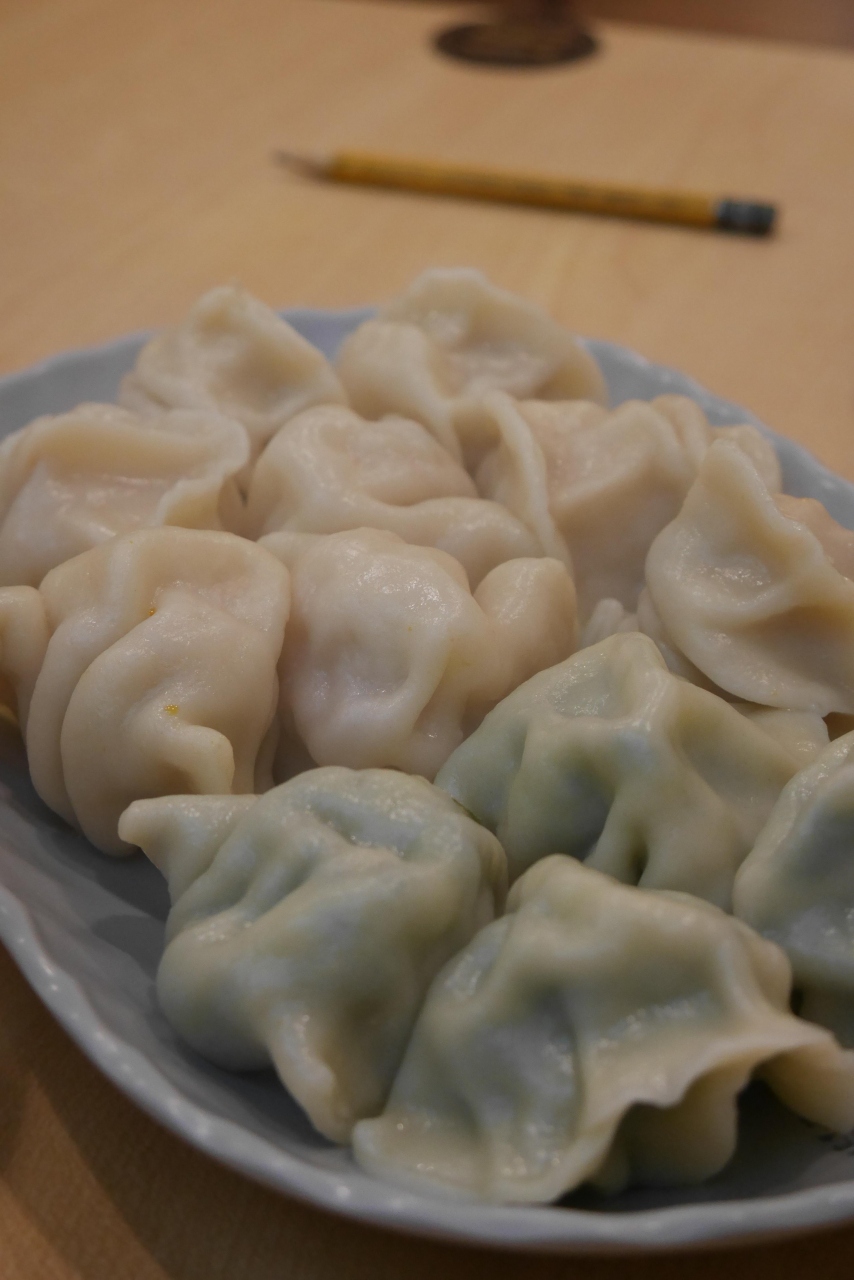 水餃子(1個5元)、ニラ水餃子(1個5元)、エビ水餃子(1個8元)、イカ団子入りスープ(25元)をいただきました。味も悪くはなかったです。- 旅行時期