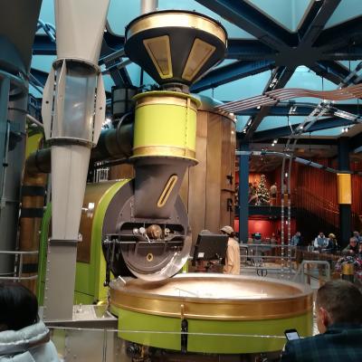 巨大な焙煎機が店舗中央にあり、焙煎の様子を眺めながらコーヒーを楽しめます。