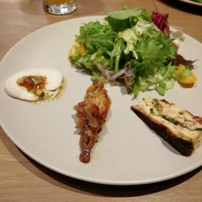 前菜3種盛り・サラダ・メイン料理・ドリンク2杯付きのセットです。パスタ、ピザ、肉料理などのメイン料理により1000円~1500円です。パスタをいただきましたが美味しかったです。