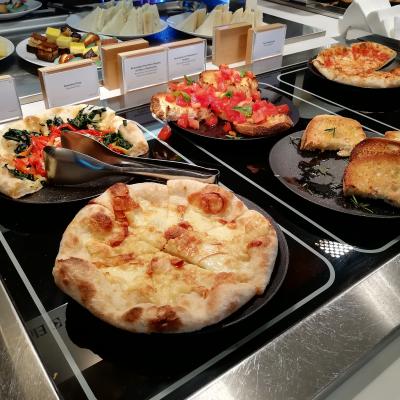 お昼12時になると石窯で焼いた焼きたてのピッツアやパスタが提供されます。サラダやチーズ、デザートも充実しています。