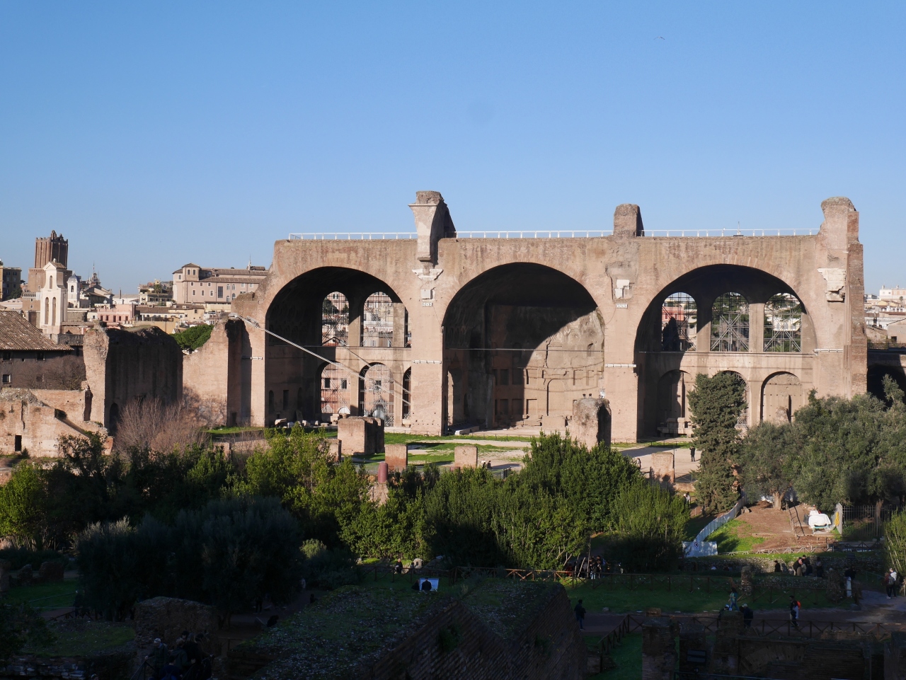 フォロ・ロマーノの中にある遺構のなかで最大のものです。それでも元の構造の一部なので、元の建物の巨大さを考えると驚きです。開口部の美しいアーチ型など、2000年前のローマの建築技術の高さを感じられる遺構です。パラティーノの丘に登ると全体を眺められます。