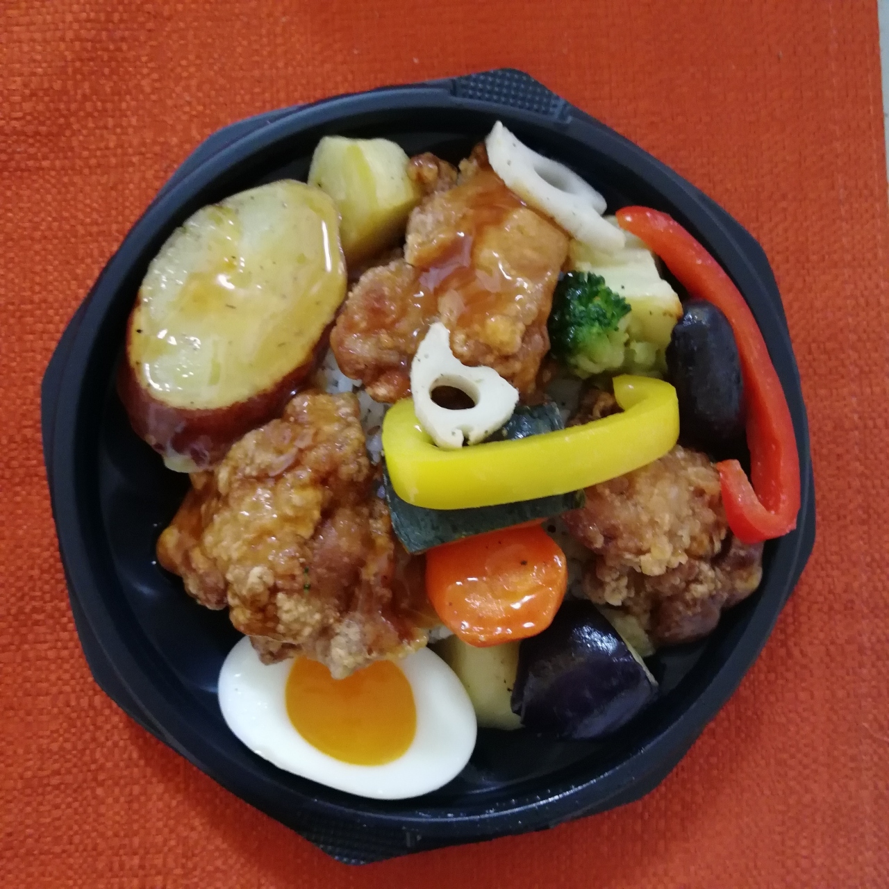 今回は「ごろごろ野菜と竜田揚げ甘酢十八穀米」弁当(648円)を購入しました。