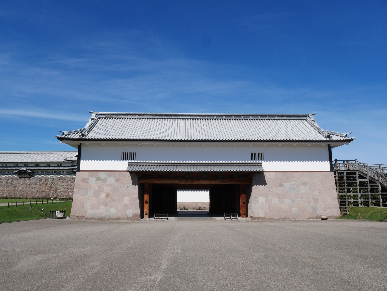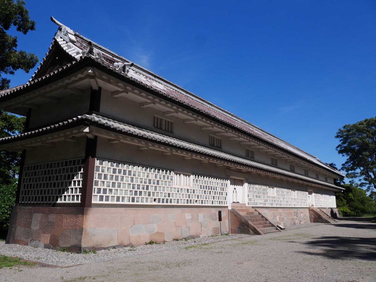 金沢城西側の高台にひっそりと建っている2階建ての倉庫です。メインの場所から少し離れているので見落としてしまうかもしれません。平時は倉庫ですが、非常時には防護壁となるような仕掛けも施されているそうです。もともとは江戸時代初期に建てられたそうですがその後焼失。幕末期に再建され現在まで残っているそうです。
