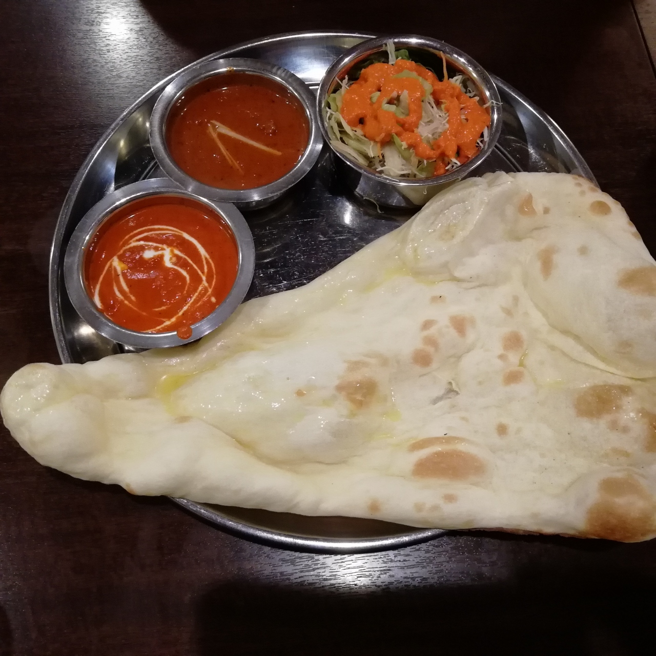Cセットでバターチキンとマトンカレーにしました。ナン・ライスは食べ放題、サラダとドリンクがついて900円です。