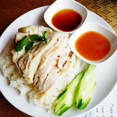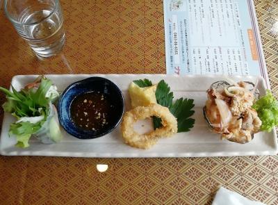 ランチセットのカオマンガイとクイッティアオ・パッキ(辛い焼きそば)を注文し二人でシェアしました。両方とも前菜3種盛り、スープ、デザート、ドリンクつきで1,380円です。