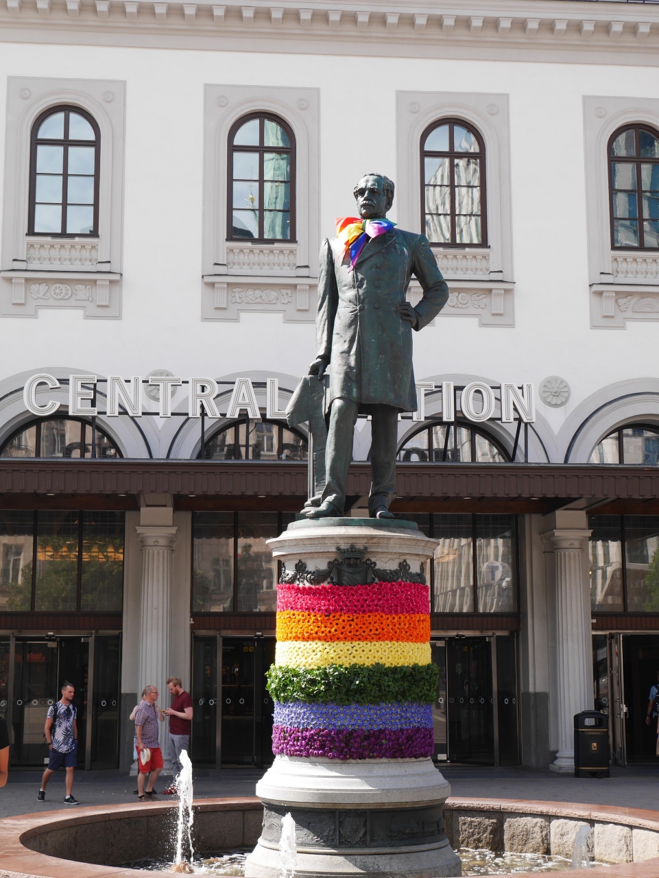 駅の正面には、スウェーデン鉄道網の整備に多大な貢献をしたニルス・エリクソンの像が建っています。プライドパレードの時期だったので像にレインボーカラーの飾りが施されていました。- 旅行時期