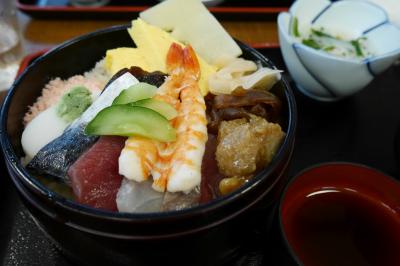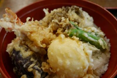 金目鯛の天丼ですが、数種類の天ぷらのなかのひとつが金目鯛、というだけ。しかも小さい・・。ちらし丼の具は海鮮とそれ以外(かまぼこや卵焼きなど)が半分半分くらいですが、どれも味がいまいち。いかにも観光客相手の店だな、という感じでした。