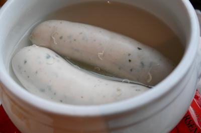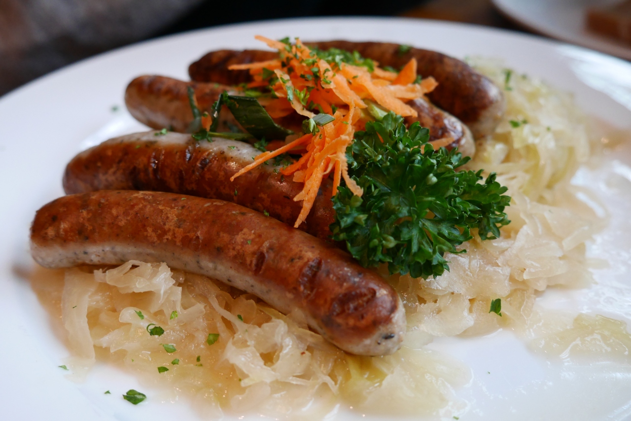 ヴァイスヴルスト(プレッツェル付でEUR6.5)とニュルンベルガーヴルスト(パン付でEUR9.5)とヴァイスビア(一番小さいサイズでEUR3.7)を注文。