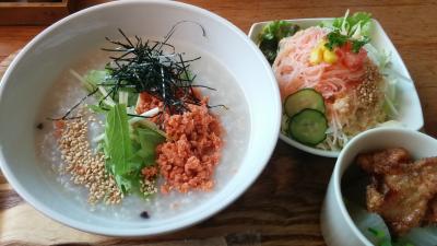 お粥は数種類から選べます。私は「シャケと水菜」にしました。シャケの塩味がしっかりしていて薬味は必要なかったです。シャキシャキの水菜も美味しかったです。- 旅行時期