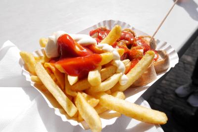 土曜日でしたが、お昼には遅い時間だったのでそれほど並ばずに(10分弱)買えました。カレーヴルスト単品はEUR1.9のようですが、ポテトやケチャップ、マヨネーズをつけるとEUR4.2になりました。