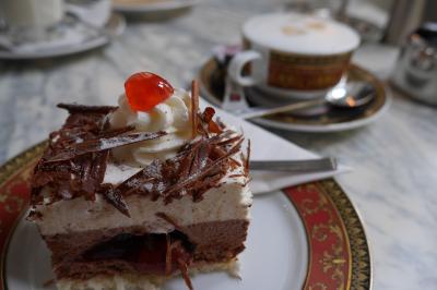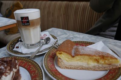 シュバルツバルターケーキ(EUR3.4)とアイアシェッケ(ドレスデンチーズケーキ)(EUR3.3),カプチーノ(EUR3.0),ラテマキアート(EUR3.8)を注文。